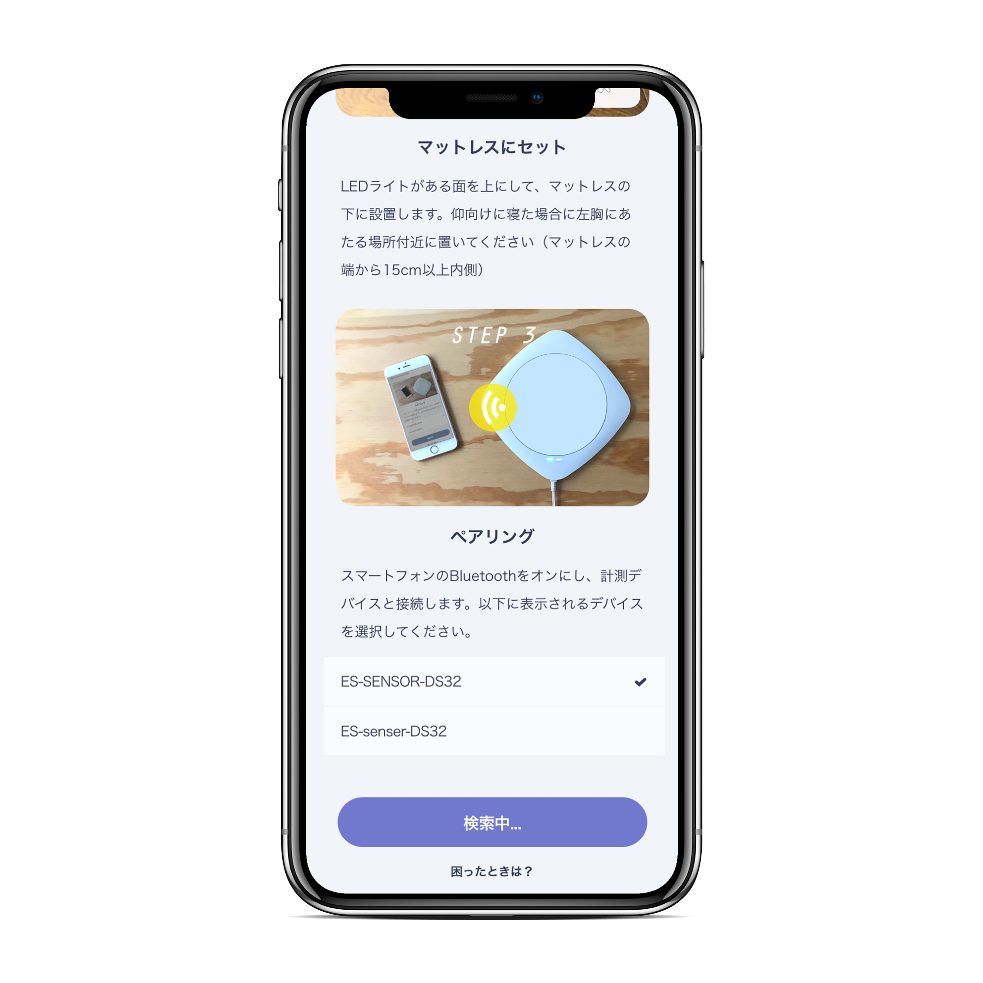 Sleepセンサーを感知すると、センサー名「ESXXXXXXX」が表⽰されます。センサーを選択すると、最下部のボタンステータスが、「接続中」から「次へ」に変化します。ボタンを押すと、センサー設定は完了です。