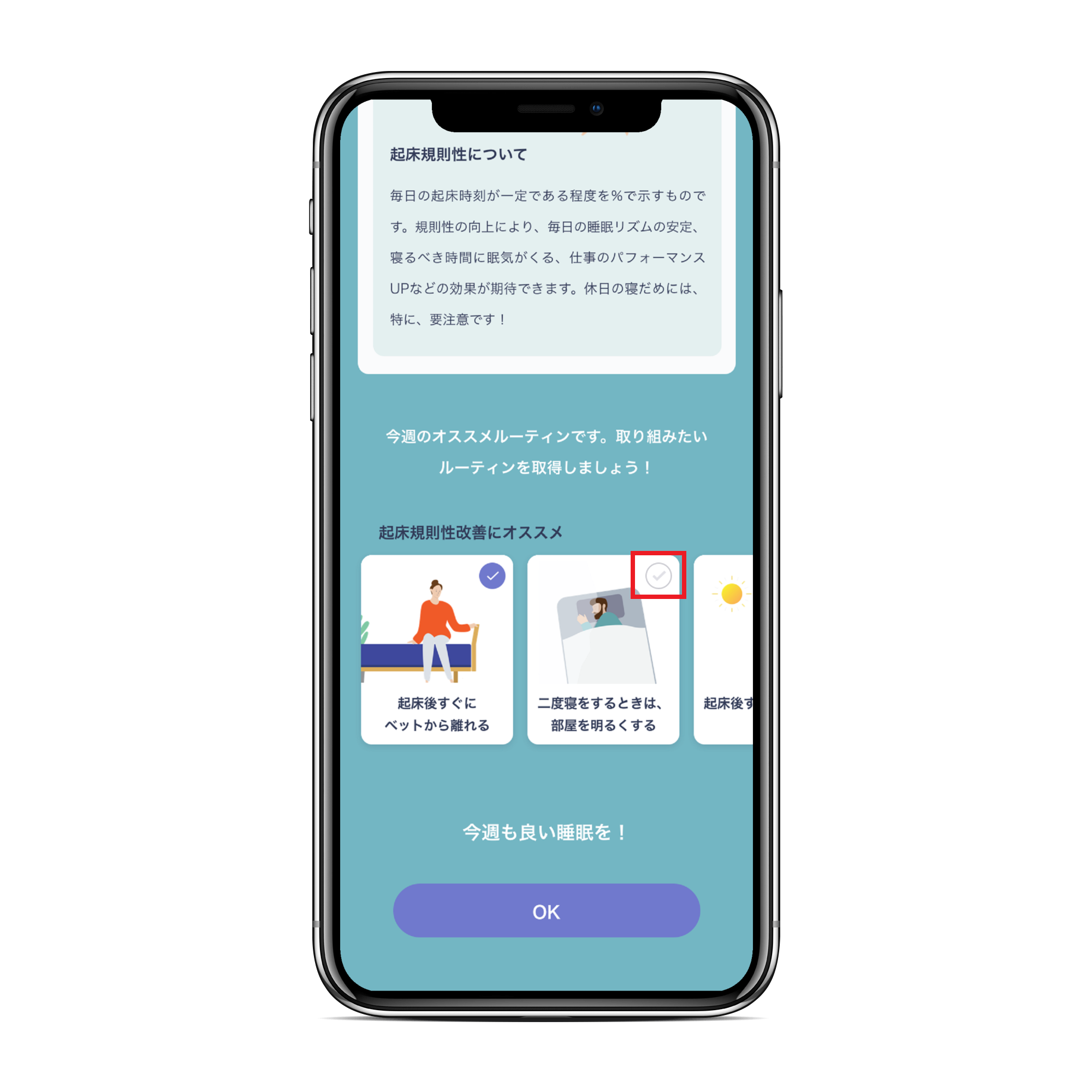 2. プログラム開始後は、毎週土曜日に週間レポートが生成され、レポート画面で翌週に取り組みたいルーティンの選択をします。翌週に取り組みたいルーティンを選択(Tap)しましょう。(各ルーテインの右上「✓」マークをタップします)。取り組みたいルーティンにチェックが入ったことを確認し、画面下部の「OK」ボタンをタップします。